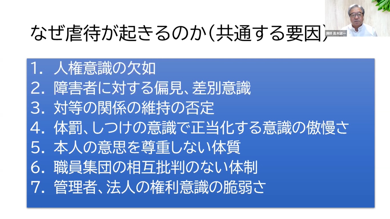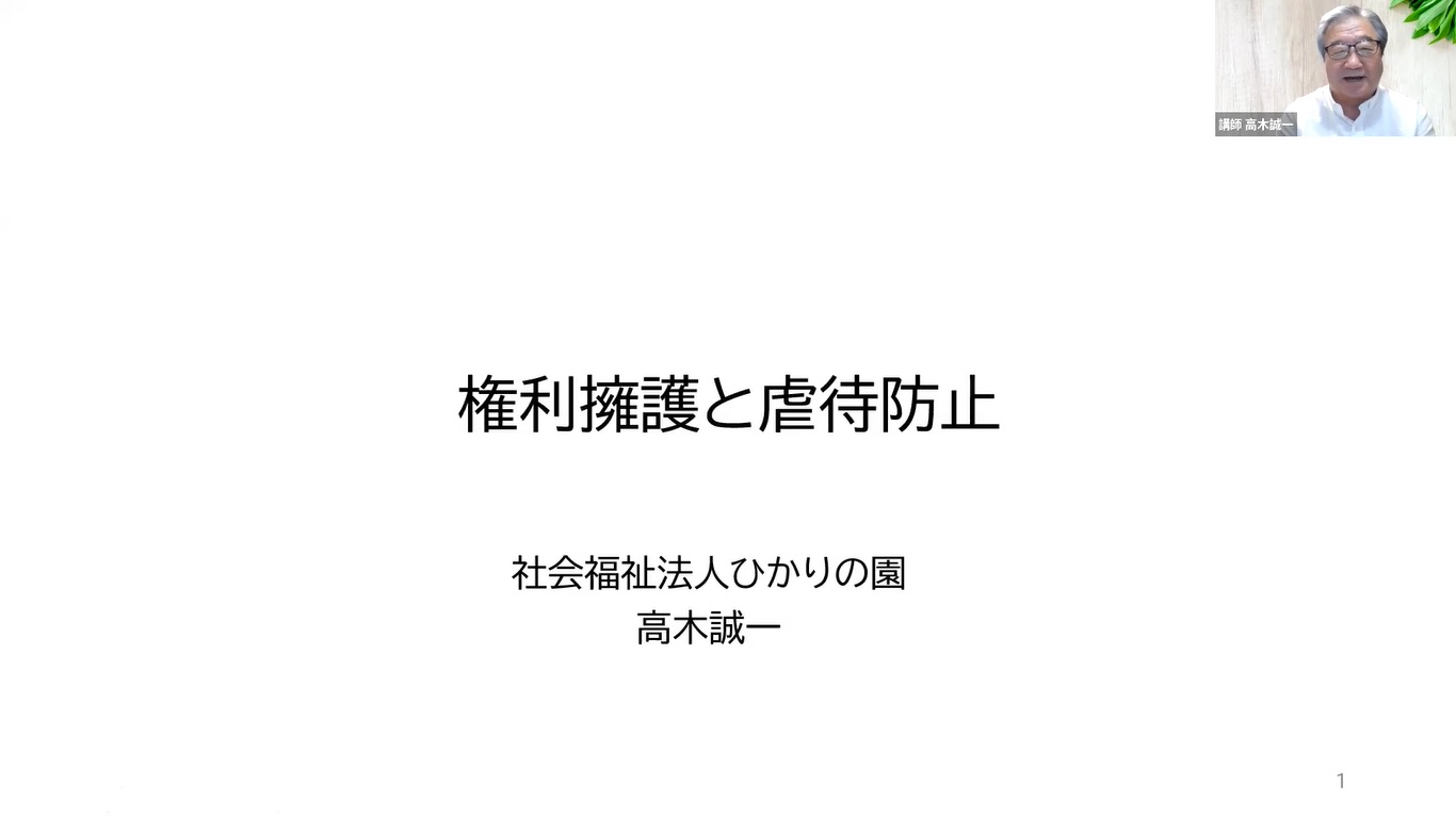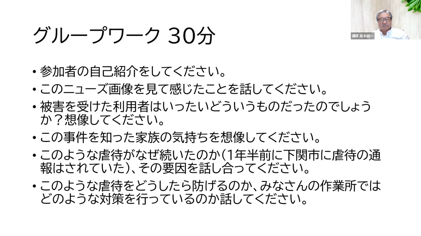 2022年7月11日(月)に、西部地区会主催の障害者虐待防止研修をオンライン(Zoom)で開催しました。講師は、昨年度に引き続き当会顧問の高木誠一氏(社会福祉法人ひかりの園)に担当していただきました。虐待防止に関しては、今年度より様々な事が義務化となり、その一つでもある虐待防止研修は、各事業所の意識も高く40名の参加がありました。