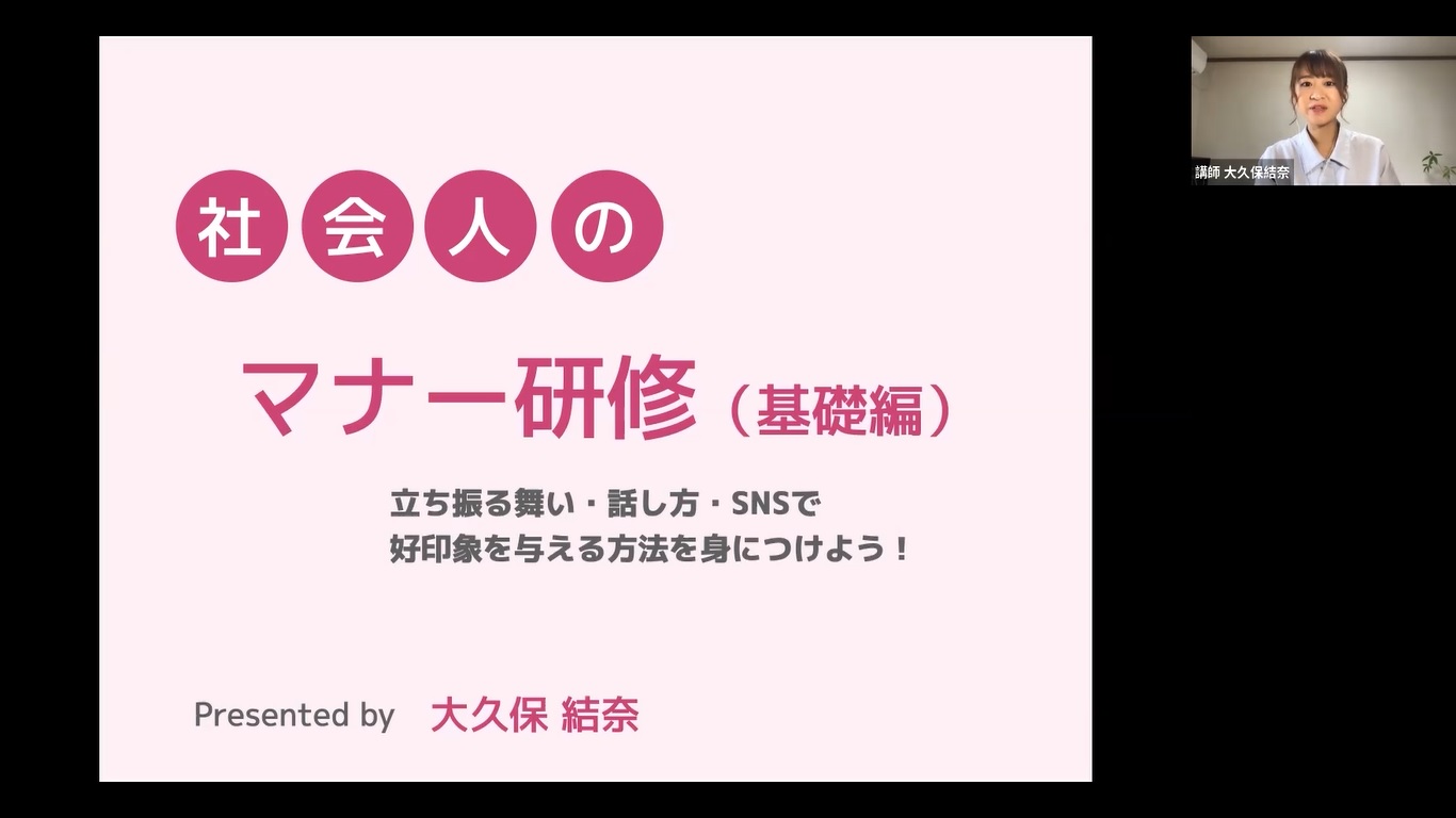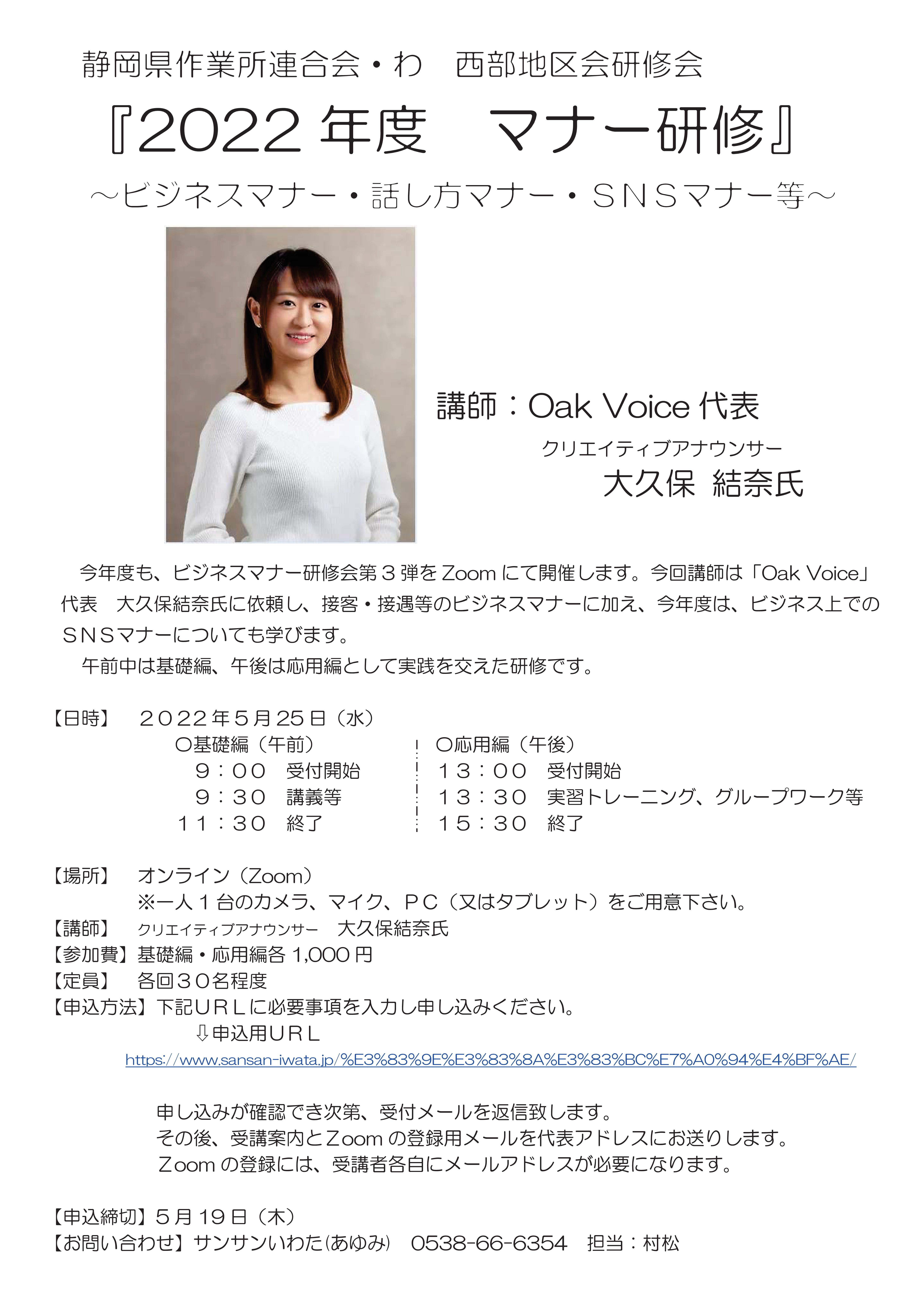 2022年5月25日に、西部地区会主催の「2022年度マナー研修」をオンライン(Zoom)で開催しました。今年度の講師は、クリエイティブアナウンサー「Oak Voice」代表 大久保結奈氏に担当いただき、午前(基礎編)は、接客・接遇等のビジネスマナー座学、話し方、ビジネス上のSNSマナーについてをおこない、午後(応用編)は、話し方上級スキルを学んだ後、グループワークを実施しました。その後、SNSの運用編についてレクチャーしていただきました。今年度新たな内容として、SNSに関する内容を取り入れた所、参加者の皆様からはより深めた内容も知りたいとの声もありましたので、今後、SNSに特化した内容の研修も開催できればと感じました。今後も、マナー研修は継続的に開催していきたいと思います。